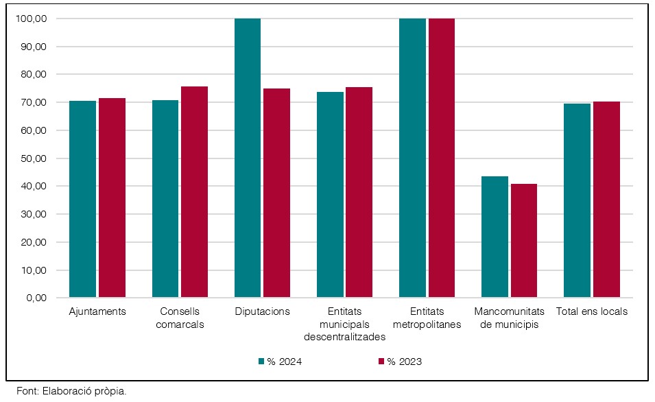 Amb excepció de les diputacions i l’Entitat Metropolitana, cap tipus d’ens assoleix el 100% en el compliment de la tramesa. Els ajuntaments i els consells comarcals n’assoleixen el 70%, les entitats municipals descentralitzades quasi el 74% i les mancomunitats, tot i la millora respecte a l’exercici anterior, tan sols el 43,6%.