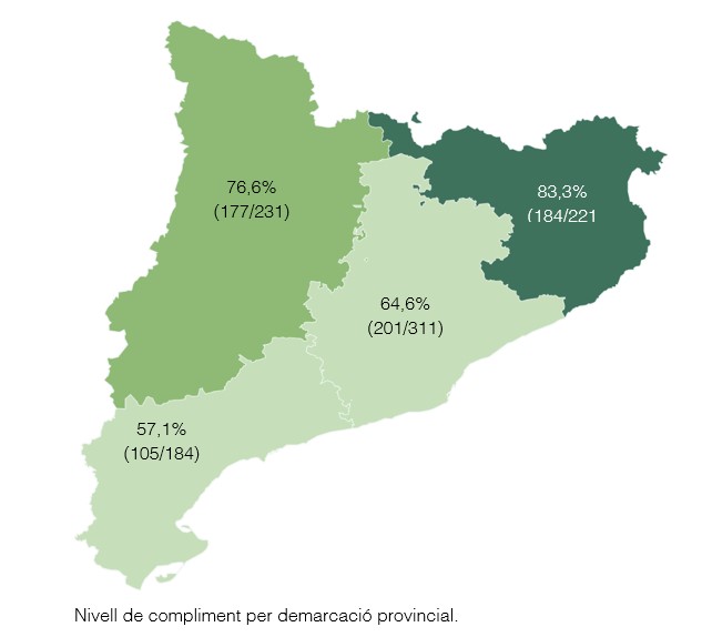 Per demarcació territorial, els municipis de la província de Girona tornen a ser els que registren les millors dades de tramesa dins de termini (83,3%), seguits dels de Lleida (76,6%), els de Barcelona (64,6%) i, en darrer lloc, els de Tarragona (57,1%).